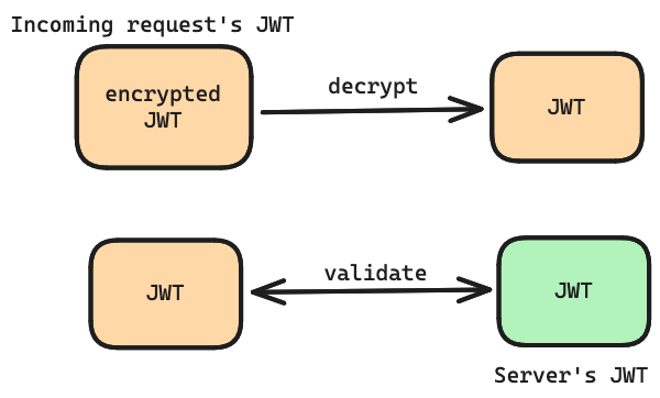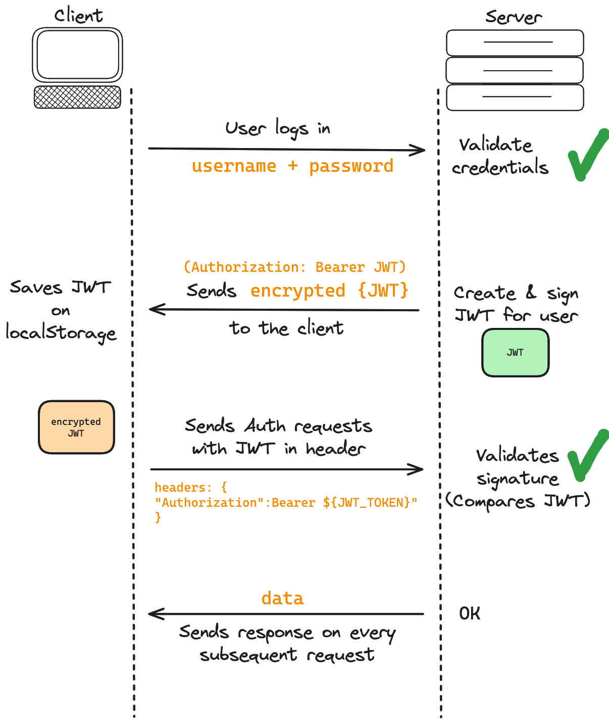 Server-side Verification: On receiving a request with a JWT, the server doesn't need to recheck the user's credentials in its primary database. Instead, it simply verifies the JWT's signature using its secret key. If the signature matches, it means the token is legitimate and hasn't been tampered with.