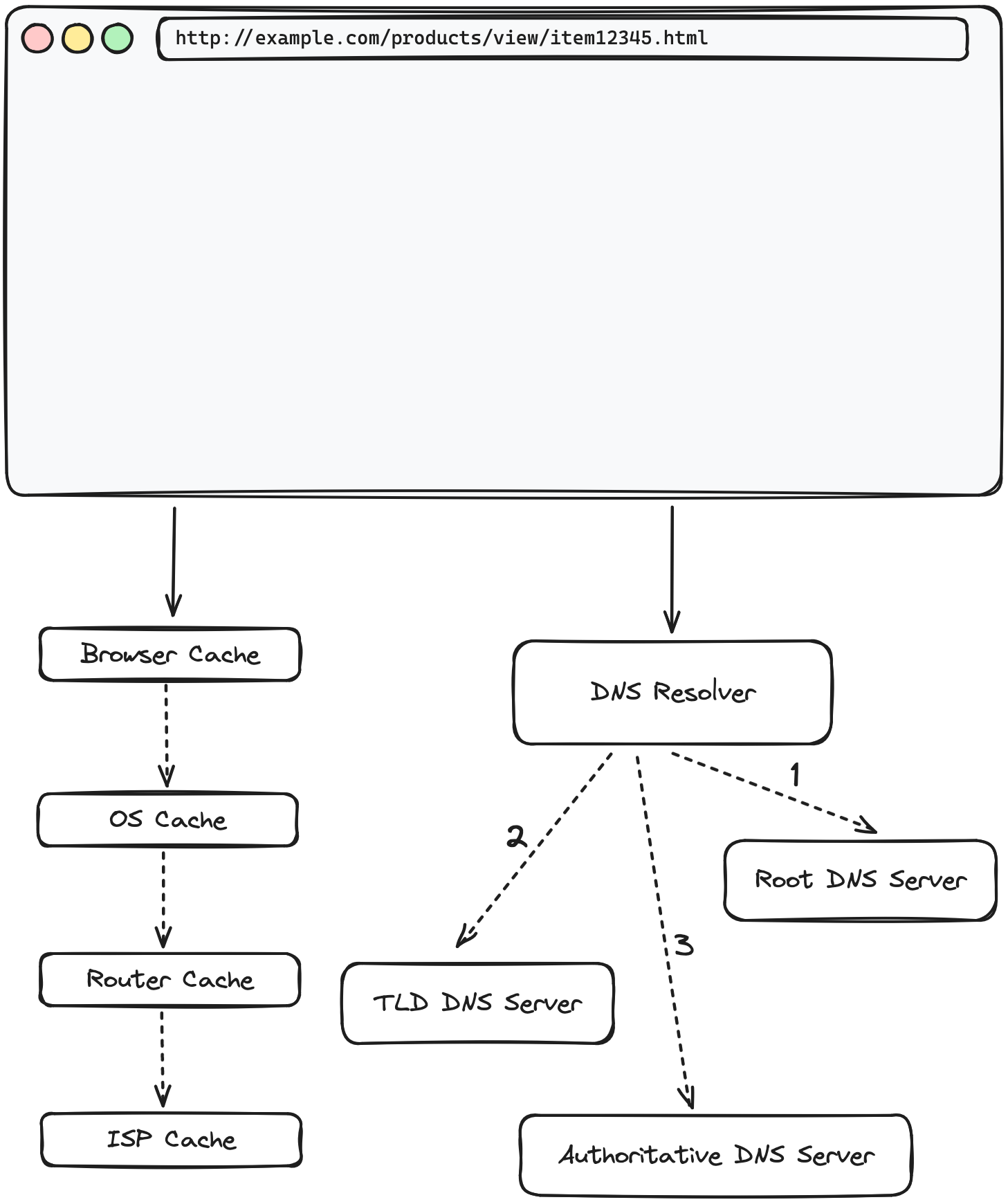- Browser Cache: The browser first checks its own cache to see if the IP address for