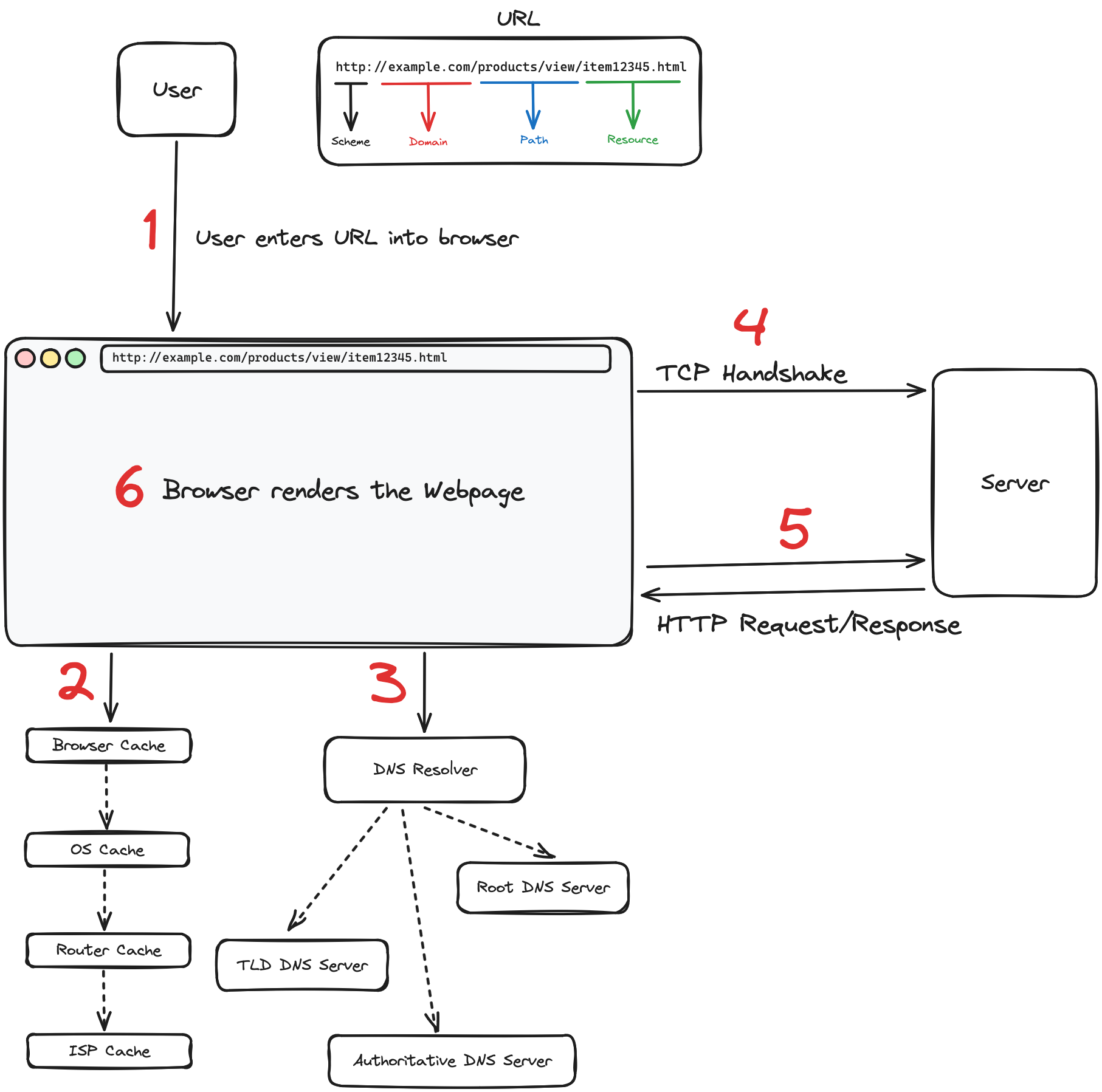 When you enter a URL into your browser, it initiates a complex series of operations. This process, which transforms a URL into a webpage, involves a coordinated interaction of various web protocols and systems. In my early backend development interviews, this topic was often highlighted, emphasizing its importance in understanding web functionalities. Let's delve into each step of this process in detail, exploring the technical intricacies involved from the moment a URL is entered to when a webpage is displayed.